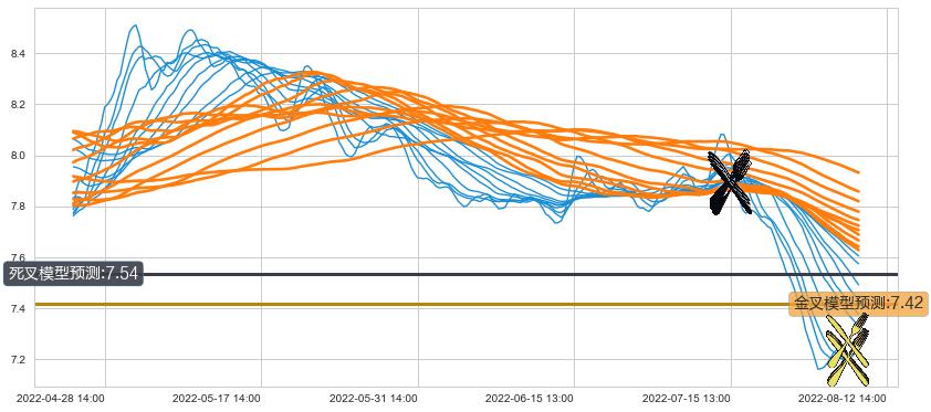 ➣ 60小时均线于(07-14 14:00: 7.88)形成【死叉】基于【死叉历史模型】预测死叉后最低波谷价格: 7.52, 死叉后最低价格7.14,已经下跌超出预测最低波谷价格, 预期反弹