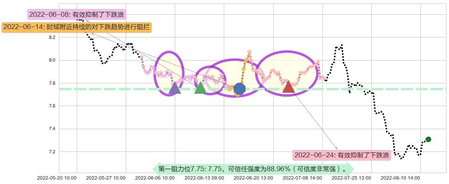 2022-06-14: 时域附近第一阻力位7.75持续的对下跌趋势进行阻拦,有效地放缓了下跌的速度。