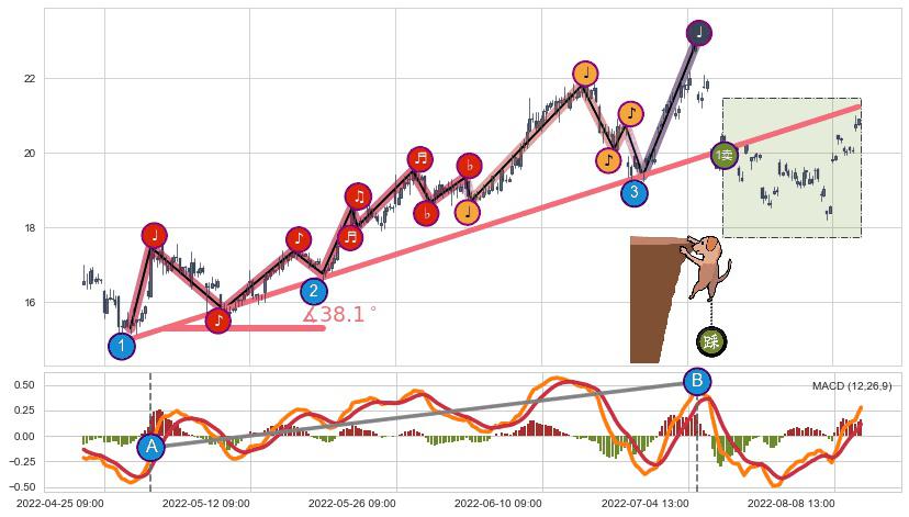 从2022-04-26 14:00至2022-07-15 13:00,共包含210个小时,阶段股价上涨26.49%,阶段股价变动位移路程比: 1 : 8,上涨趋势角度: 38.1