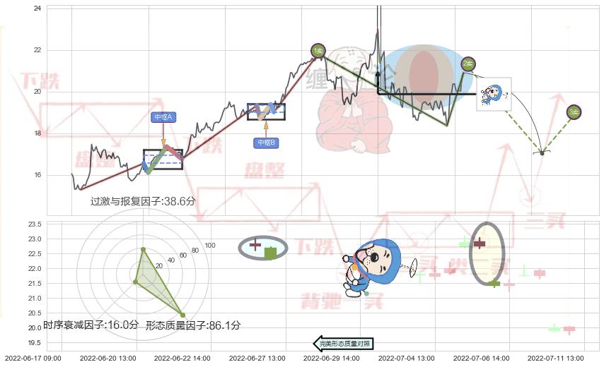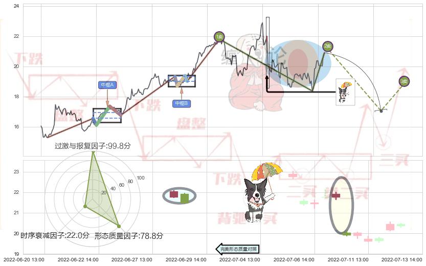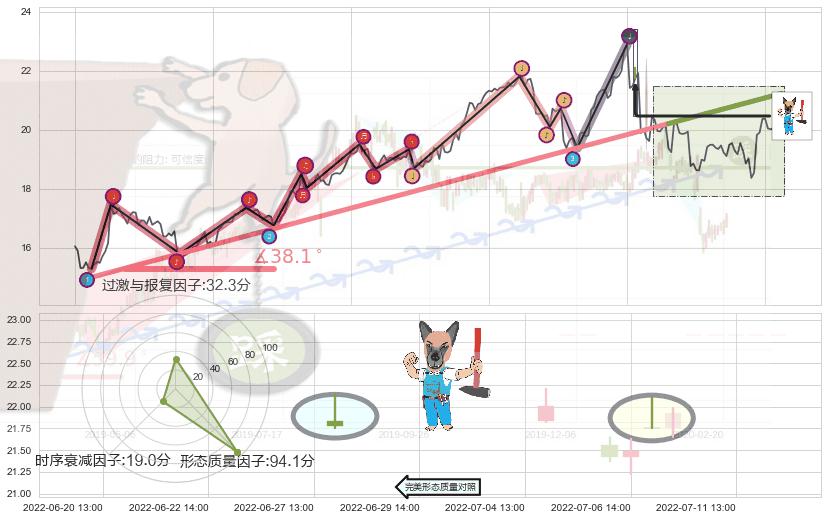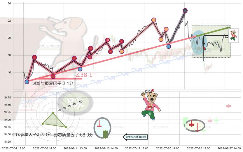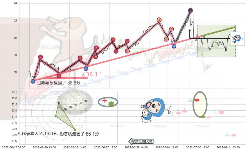 ➢ 2022-04-26 14:00-2022-07-15 13:00上升趋势存在反转[风险],虽然原上升趋势的支撑位(21.23)已破位,但其支撑效果尚存,原上升趋势角度: 38.1˚