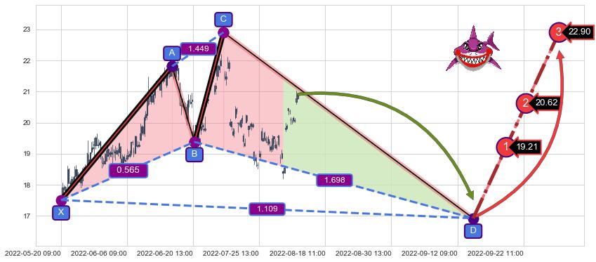 ➢ 距离预测D点位置有足够的下跌空间, 与看涨【鲨鱼】形态相反,实际方向【看跌】