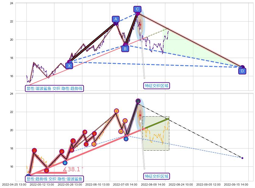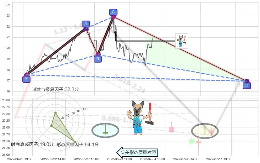 ➢ 2022-04-26 14:00-2022-07-15 13:00上升趋势存在反转[风险],虽然原上升趋势的支撑位(21.23)已破位,但其支撑效果尚存,原上升趋势角度: 38.1˚