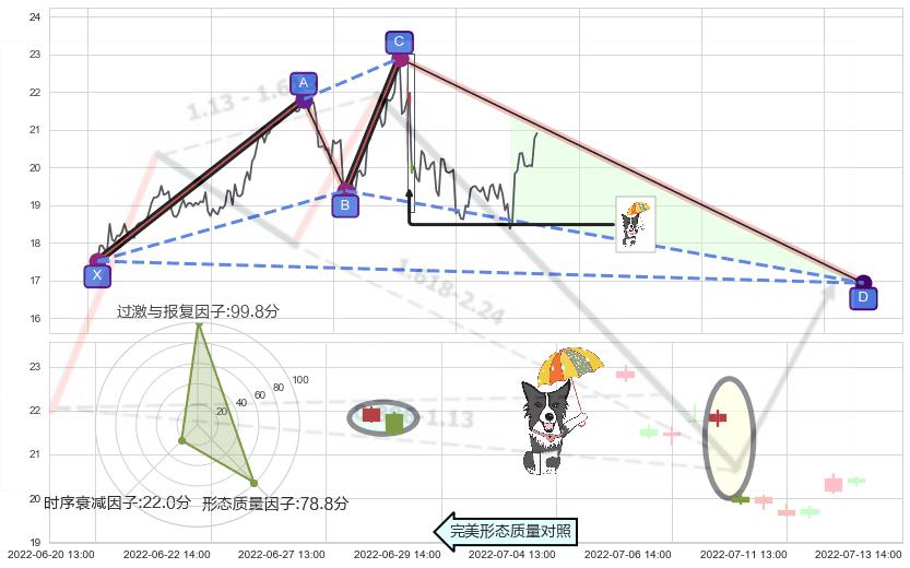 ➣ 下跌螺旋桨 + 谐波鲨鱼上拉击穿c下跌拐点信号叠加后【目标达成率】中等,【看空】信号叠加【存续影响中等】