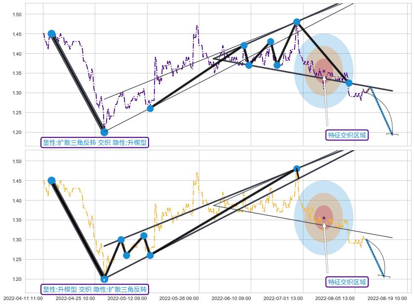 ➣ 扩散三角反转:下行突破支撑位破位, 猜想持续下沉下跌,被突破的支撑位已变为阻力位