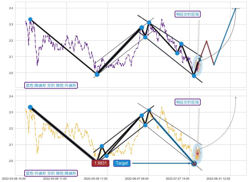 ➢ 升旗形:下跌目标target已达成:猜想强支撑位临近,预期反弹上涨(均值回复)