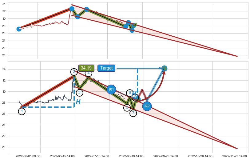 ➢ 最小中继整理涨幅→𝐇: 5.59 (𝐇楔型旗杆的长度:楔型起点→顶点)