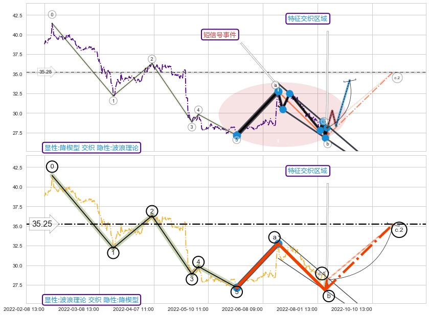 从2022-06-24 14:00至2022-08-12 14:00,共包含71个小时,阶段股价下跌-13.82%,阶段股价变动位移路程比: 1 : 4,2022-08-10 13:00向↘︎形成缺口,跳空下跌-7.03%˚