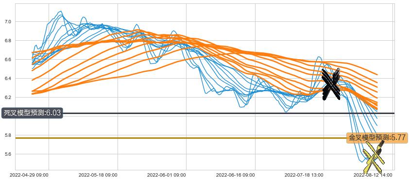 ➣ 60小时均线于(07-20 14:00: 6.31)形成【死叉】基于【死叉历史模型】预测死叉后最低波谷价格: 5.97, 死叉后最低价格5.47,已经下跌超出预测最低波谷价格, 预期反弹