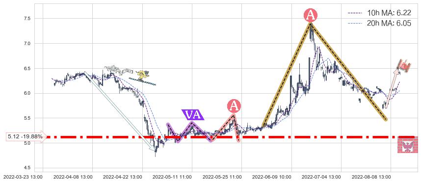 ♘ 支撑价格位5.12,可信任强度95.52%,距离最后交易2022-08-12 14:00形成的收盘价格6.39相差 -19.88%