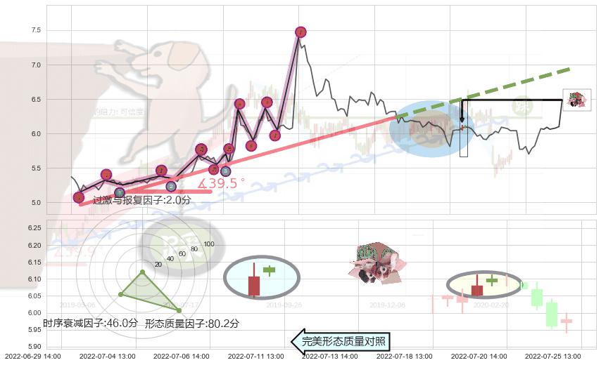 ➣ 2022-05-24 14:00-2022-07-04 14:00上升趋势存在反转[风险],其原上升趋势的支撑位(6.94)已破位[强阻力信号],原上升趋势角度: 39.5˚