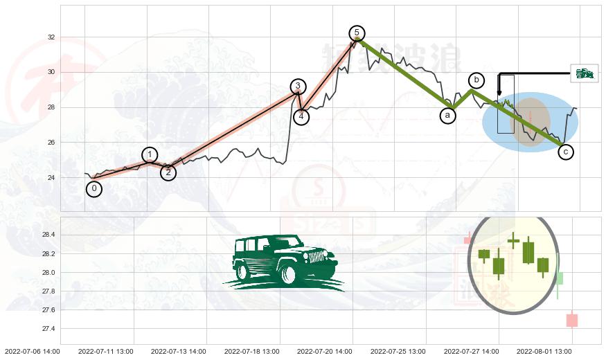 ➢ 波浪理论:猜想击穿破位c点后继续下跌 → 下跌 → 风险信号 → 小趋势跟踪