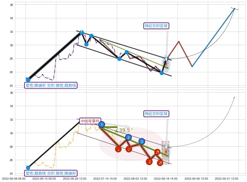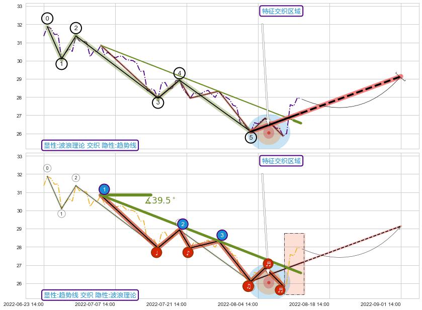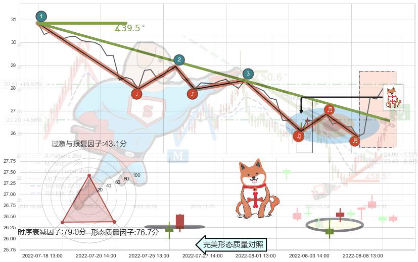 ➢ 2022-07-05 14:00-2022-08-11 14:00下跌趋势存在反转上涨[机会],其原下跌趋势的阻力位(26.56)已被突破[强支撑信号],原下跌趋势角度: 39.5˚