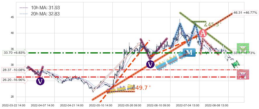 ♞ 10小时均线:31.93,20小时均线:32.83→ 快线<慢线
