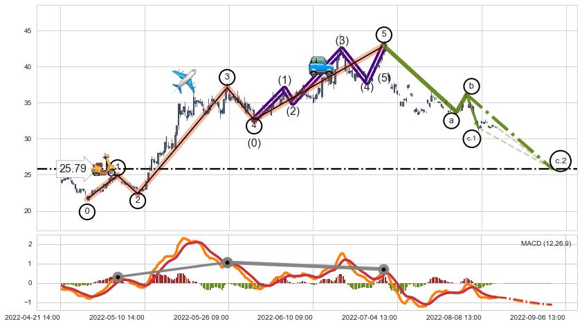 ➣ 波浪理论:猜想达到c点后小反弹终止反转下跌 → 下跌 → 【拐点】临近 → 阶段均值回复结束后继续大周期趋势跟踪