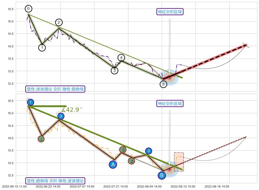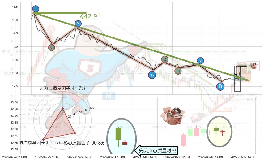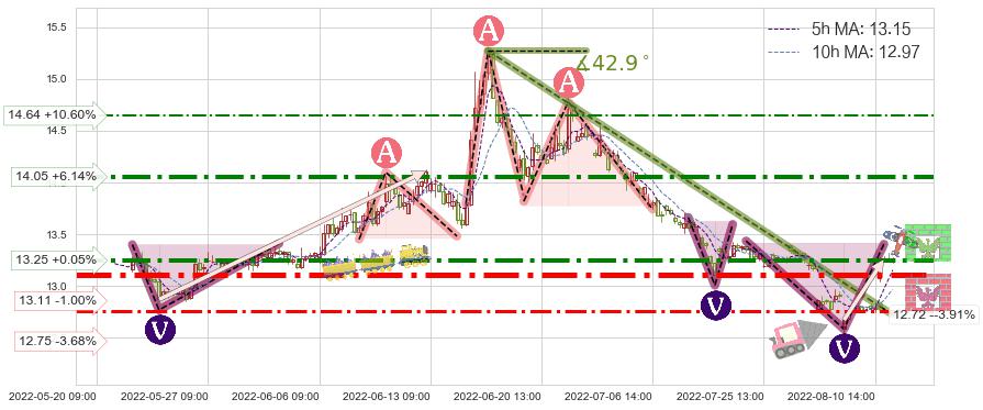 ➢ 2022-06-15 13:00-2022-08-11 13:00下跌趋势存在反转上涨[机会],其原下跌趋势的阻力位(12.72)已被突破[强支撑信号],原下跌趋势角度: 42.9˚