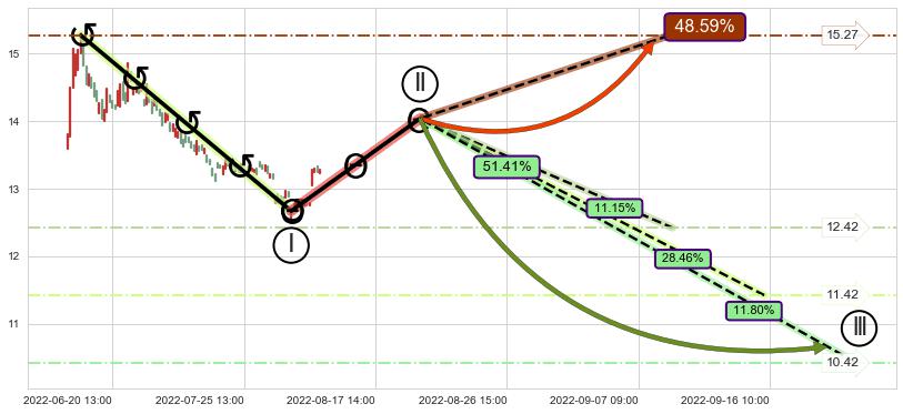➢ 循环浪继续向下【最高】位置(09-08:15, 12.42),匹配聚类样本比例21.69%, 可能性概率11.15%
