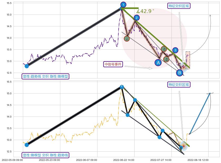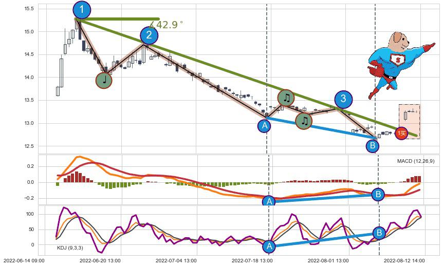 从2022-06-15 13:00至2022-08-11 13:00,共包含89个小时,阶段股价下跌-13.87%,阶段股价变动位移路程比: 1 : 4,下跌趋势角度: 42.9