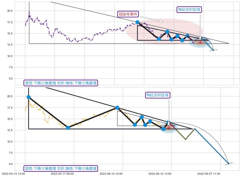 ➣ 下跌螺旋桨 + 下降三角整理支撑破位转换阻力下跌信号叠加后【目标达成率】中等,【看空】信号叠加【存续影响中等】