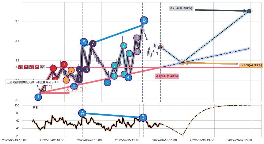 ♘ 在最后的上升阶段2022-05-24 14:00至2022-08-03 14:00存在 持续未破位的支撑位 ,支撑价格3.130,支撑可信任强度84.35%,其距离最后价格3.340相差 -6.30%
