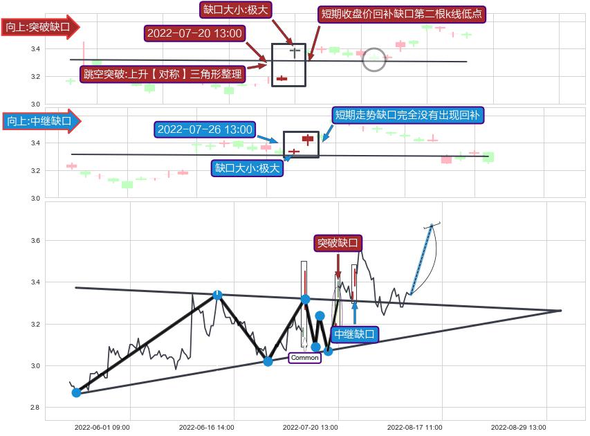 ➣ 突破缺口形成后,后续k已经超过14根,跳空突破上升【对称】三角形整理关键点后, 出现【中度回踩】迹象,短期收盘价回补缺口第二根k线低点