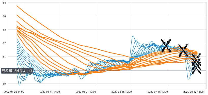 ➣ 40小时均线于(07-13 14:00: 5.18)形成【死叉】基于【死叉历史模型】预测死叉后最低波谷价格: 5.04, 死叉后最低价格4.91,已经下跌超出预测最低波谷价格, 预期反弹