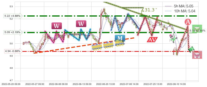 ➢ 【仅预测突破】最后价格:4.98与预测突破价格:5.15→【空间较大】后续最小【整理】第一目标价格→(08-23:14: 5.40 )
