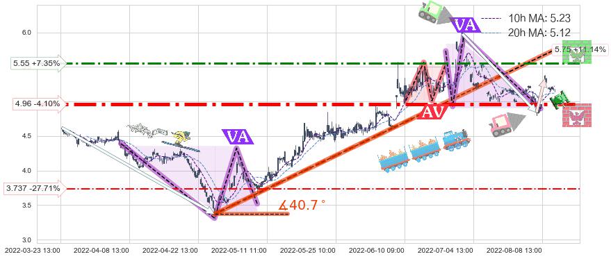 ♘ 阻力价格位5.55,可信任强度59.42%,距离最后交易2022-08-12 14:00形成的收盘价格5.17相差 +7.35%