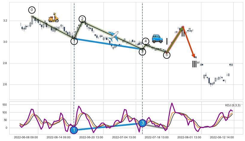 ➣ 第一, 三驱动浪端点:【KDJ】走势出现【常规背离 & 反转信号】背离程度95.08%,背离夹角角度41.3˚,背离程度中等