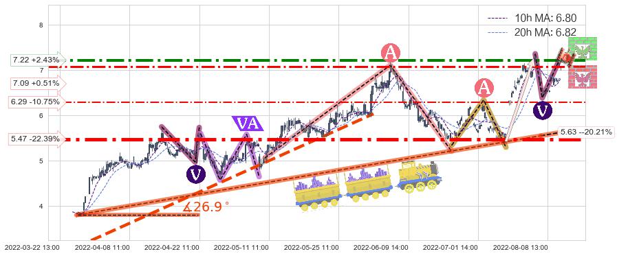 ♘ 阻力价格位7.22,可信任强度73.25%,距离最后交易2022-08-12 14:00形成的收盘价格7.05相差 +2.43%