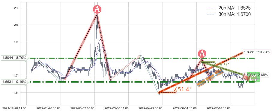 ➣ D点拟合预测价格2.011,距离最后交易收盘价格1.6600相差 +21.14%