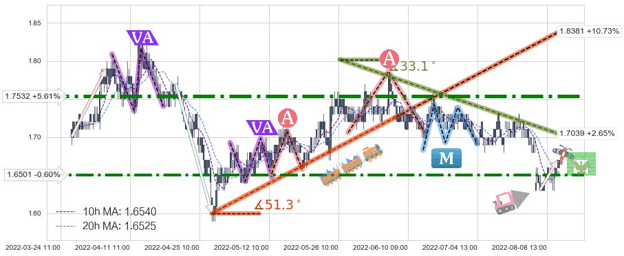 ♘ 阻力价格位1.7532,可信任强度97.19%,距离最后交易2022-08-12 14:00形成的收盘价格1.6600相差 +5.61%