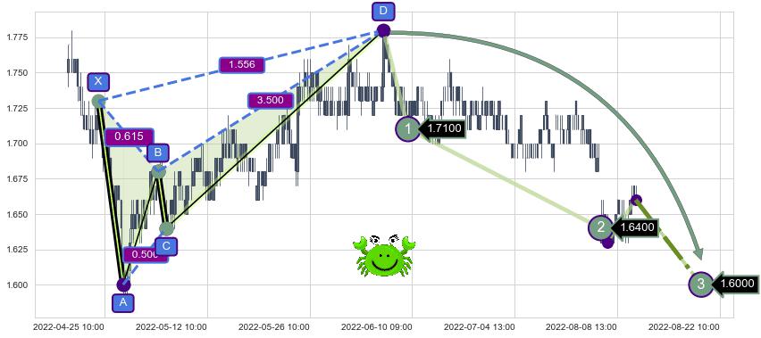 ➣ 谐波蝙蝠:b下跌接近c:猜想支撑性拉升 → 上涨 →【拐点】支撑临近 → 大趋势均值回复
