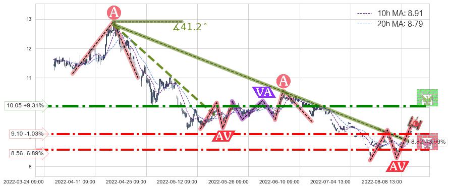 ♘ 在最后的下跌阶段2022-04-14 13:00至2022-07-21 14:00,存在 破位边缘的阻力位 ,阻力价格8.82,可信任强度76.27%,其距离最后价格9.19相差 -3.99%