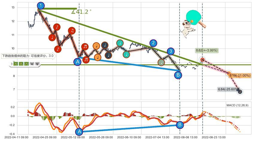 ➢ 预测:2022-08-24 13:00,【试探阻力】稳定目前下跌趋势的前提下,预测价格:8.18