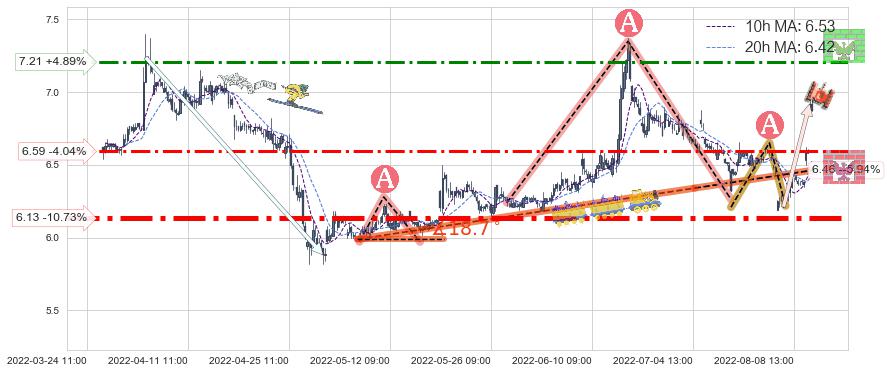 ♘ 阻力价格位7.21,可信任强度55.59%,距离最后交易2022-08-12 14:00形成的收盘价格6.87相差 +4.89%