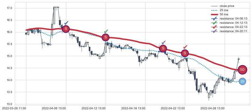 ➣ 50小时均线于(07-22 14:00: 14.22)形成【死叉】基于【死叉历史模型】预测死叉后最低波谷价格: 13.20, 死叉后最低价格12.85,已经下跌超出预测最低波谷价格, 预期反弹