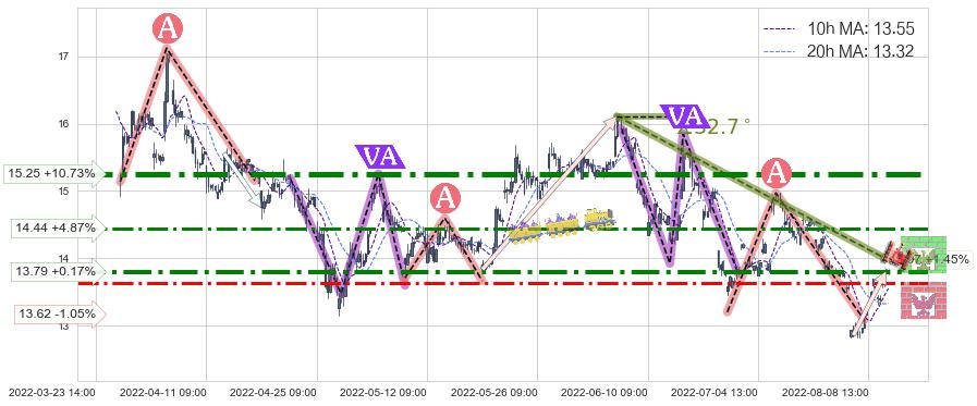 ♘ 阻力价格位13.79,可信任强度79.78%,距离最后交易2022-08-12 14:00形成的收盘价格13.77相差 +0.17%