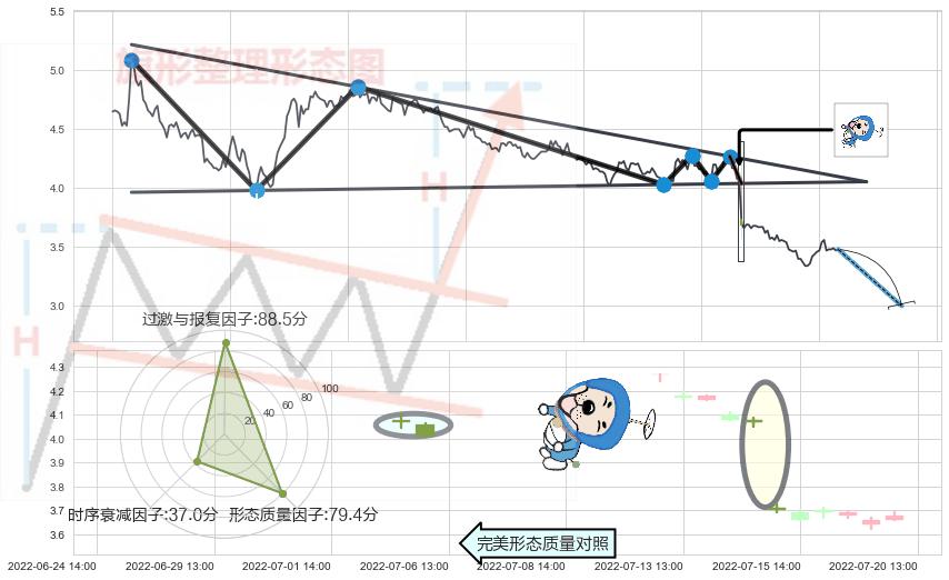 ➣ 【多空双方观望→争持→促使价格波动日益狭窄→空方打破攻守平衡点】对称三角形中继整理, 已在07-15:13突破【支撑】颈线 4.04 →演变成下降通道