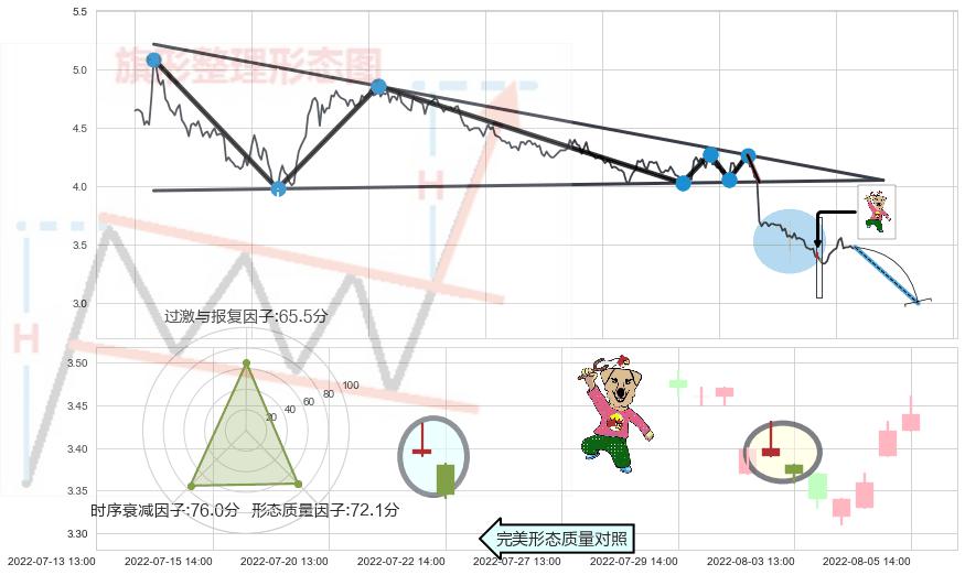 从2022-06-14 11:00至2022-08-12 14:00,共包含98个小时,阶段股价下跌-13.39%,阶段股价变动位移路程比: 1 : 6,2022-07-15 13:00向↘︎形成缺口,跳空下跌-9.09%˚