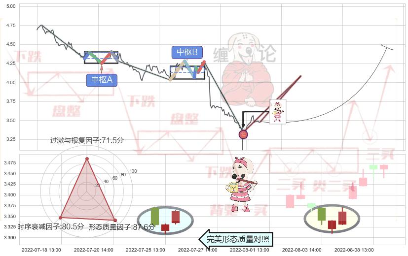 从2022-06-30 14:00至2022-08-12 14:00,共包含63个小时,阶段股价下跌-19.87%,阶段股价变动位移路程比: 1 : 2,2022-07-15 13:00向↘︎形成缺口,跳空下跌-9.09%˚