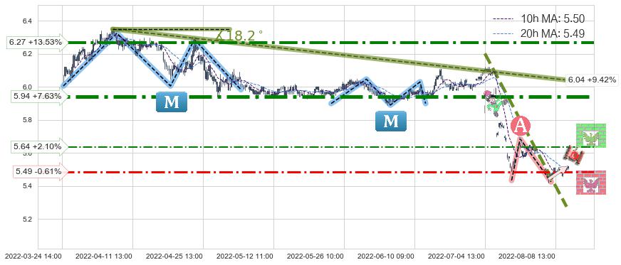 ♘ 阻力价格位5.94,可信任强度87.09%,距离最后交易2022-08-12 14:00形成的收盘价格5.52相差 +7.63%
