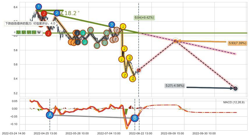 ♘ 在最后的下跌阶段2022-04-06 14:00至2022-08-12 13:00,存在 持续未破位的阻力位 ,阻力价格6.04,可信任强度86.34%,其距离最后价格5.52相差 +9.42%