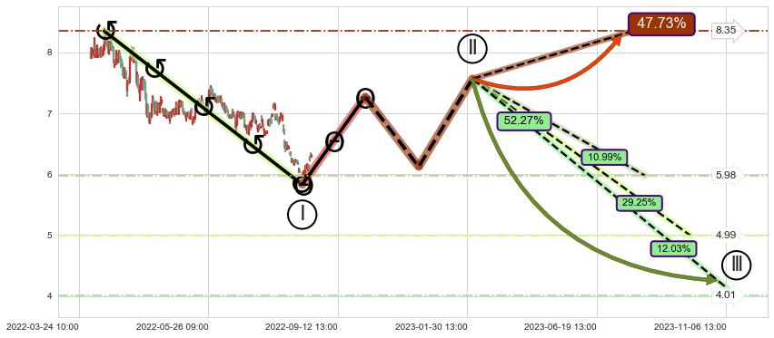 ➣ 预测:2023-01-05 13:00,【继续下探】稳定目前下跌趋势的前提下,预测价格:5.12