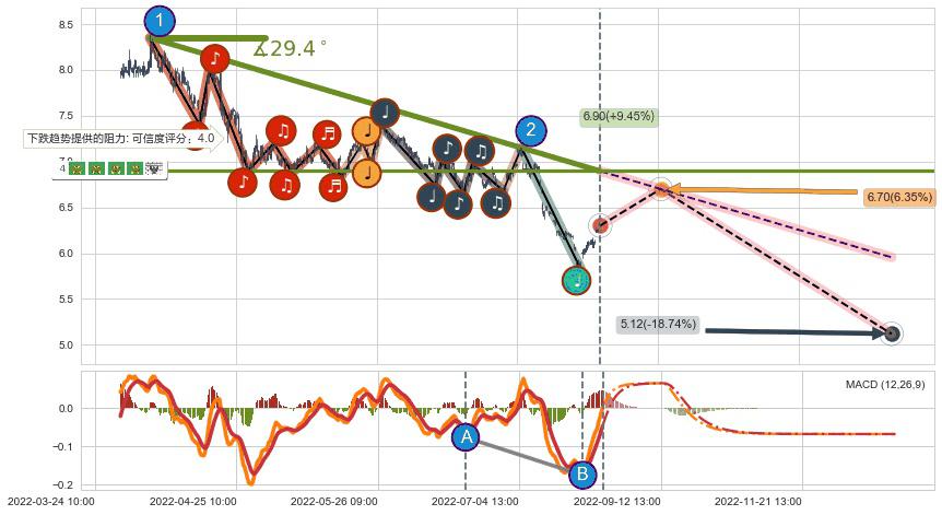 ♘ 在最后的下跌阶段2022-04-07 09:00至2022-08-11 14:00,存在 持续未破位的阻力位 ,阻力价格6.90,可信任强度85.37%,其距离最后价格6.30相差 +9.45%