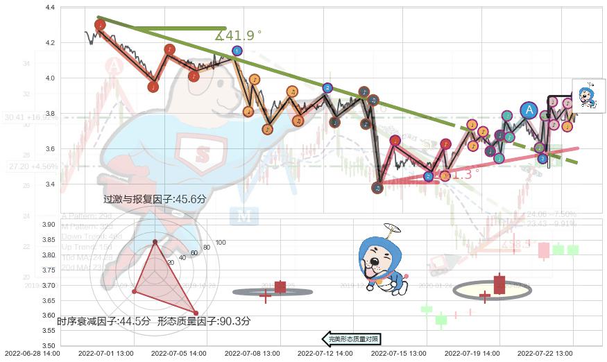 ➢ 2022-01-07 13:00-2022-05-23 14:00下跌趋势存在反转上涨[机会],其原下跌趋势的阻力位(3.518)已被突破[强支撑信号],原下跌趋势角度: 41.9˚