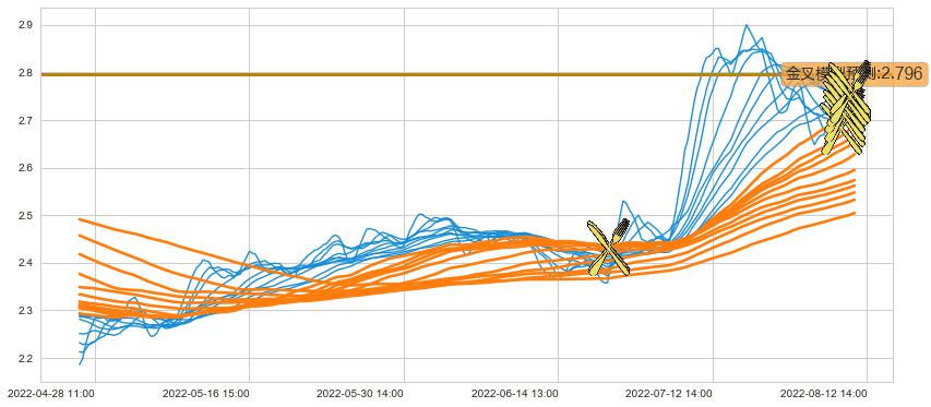 ➣ 45小时均线于(08-11 14:00: 2.763)形成【金叉】基于【金叉历史模型】预测金叉后最高波峰价格: 2.893, 金叉后最高价格2.840,尚未达到预测最高波峰价格, 预期继续上涨
