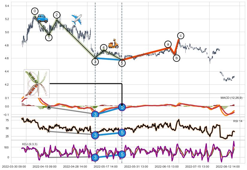 从2022-01-28 14:00至2022-03-04 10:00,共包含98个小时,阶段股价上涨0.53%,阶段股价变动位移路程比: 1 : 57