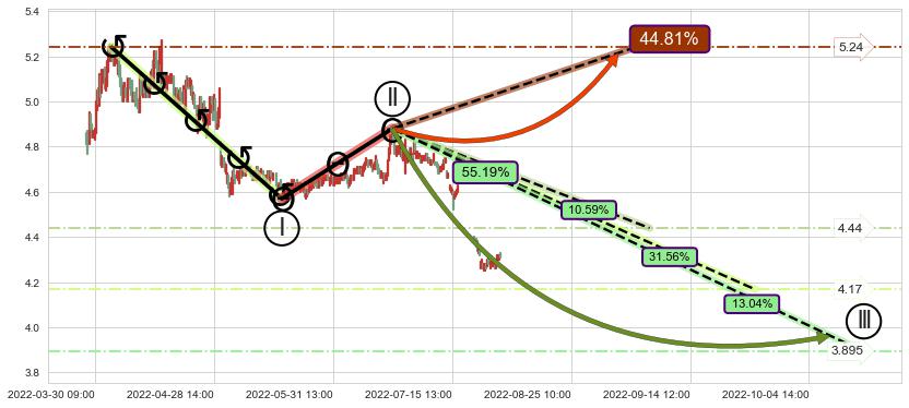 ♘ 阻力价格位4.76,可信任强度91.45%,距离最后交易2022-08-12 14:00形成的收盘价格4.31相差 +10.38%