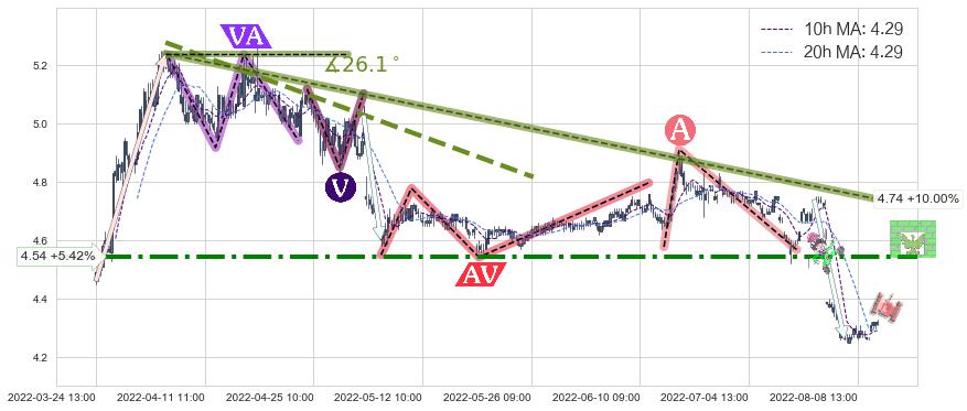 ♘ 在最后的下跌阶段2022-04-01 14:00至2022-08-12 13:00,存在 持续未破位的阻力位 ,阻力价格4.74,可信任强度85.32%,其距离最后价格4.31相差 +10.00%
