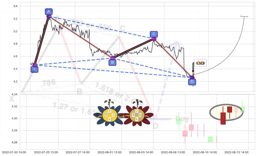 ➢ 谐波蝴蝶:c下跌到达d:猜想拉升 → 上涨 →【拐点】强支撑临近 → 大趋势均值回复